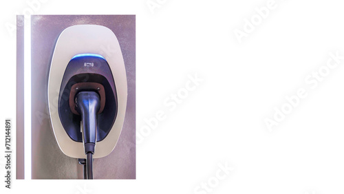 EV charging and electric car, Electric car charging station for charge EV battery, Plug for vehicle with electric engine, EV charger clean energy, Charging point at car parking lot.