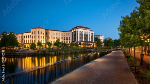 hotel, canal, waterfront, building, architecture, dusk, evening, night, light, serene, tranquil, peaceful, inviting, majestic, luxury, accommodation, travel, tour tourism, city landscape, urban, city, riverside, pathway, paseo, promenade, tree, landscaping, exterior, facades, design, elegant, sophisticated, calm, relaxing, resort, get-away, vacation, destination, picturesque, beautiful, stunning, scenic, vibrant, illumination