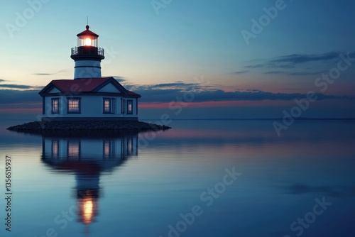 Evening light on a tranquil lighthouse by the calm water at dusk