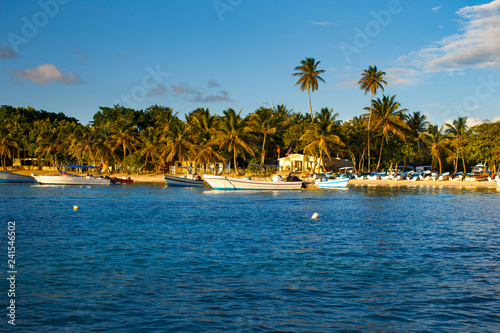 sea, tropics, caribbean, evening, sunset, dusk, boat, passenger, twilight, holiday maker, rest, vacation, excursion, trip, travel, tropical, sky, cloud, horizon, panorama, seascape, landscape, scene, guy, water, yellow, orange, palm tree, coast, pier, motorboat