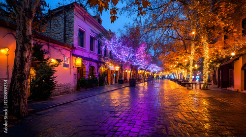 street, city, evening, light, tree, cobbled, holiday, winter, festive, illumination, europa, night, urban, town, landscape, architecture, travel, vacation, tour tourism, photo, scenery, pathway, road, walk, atmosphere, romantic, calm, peaceful, serene, magical, mysterious, dark, shadow, colours, purple, orange, yellow, beauty, dreamy, relaxing, joyful, happy, celebration, season, background