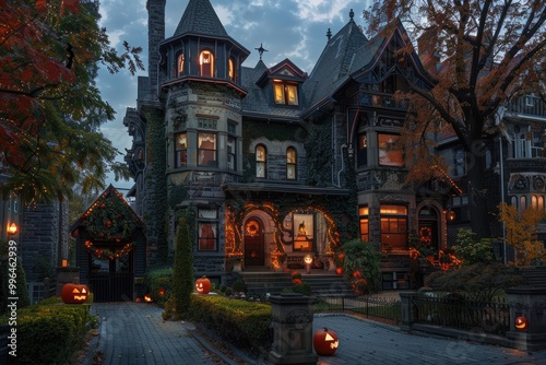 Evening view of a beautiful Halloween decorated house in Toronto Canada.