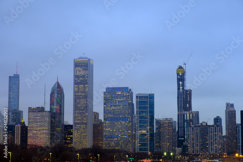 Evening view of Chicago downtown skyline, Chicago, Illinois USA