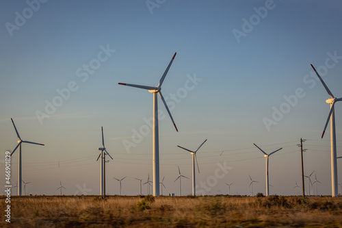 Evening view of wind farm near Balgarevo village, Dobrich county in Bulgaria