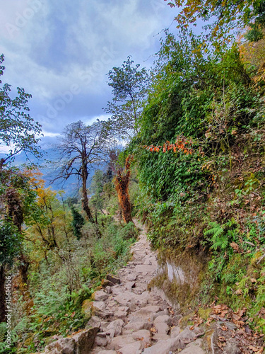 Everest base camp trek itinerary: Bupsa to Phakding, Way dowwn from Chutok La pass on th stone pass in the forest. Solokhumbu area, Nepal.
