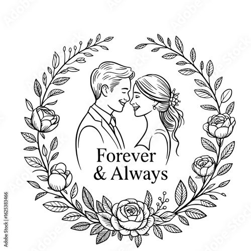 wedding, couple, love, forever, marriage, romance, wedding day, affection, commitment, togetherness, anniversary, proposal, engagement, wedding ceremony, floral, celebration, happiness, tenderness, joy, sentiment, devotion, illustration, vignetting, drawing, human relationships, 2, hugs, close, tender, sincere, romantic, bloom, leaf, flower petals, bud, growth, oneness, promise, partner, life, begin, future