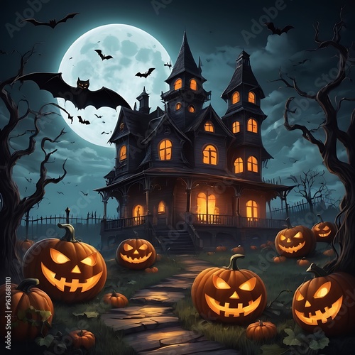 Evil pumpkins Halloween Night Scene with Bats and Haunted House, Halloween haunted mansion Halloween scary scene, Halloween house, Halloween night scene with castle