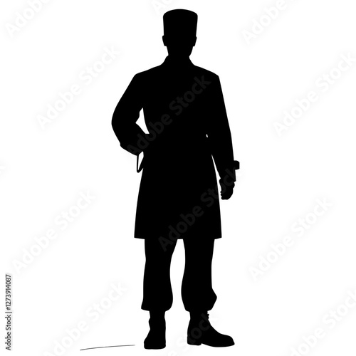 Evocative Representation of a Modern Russian Soldier's Pride and Readiness in a Backlit Silhouette on White Background