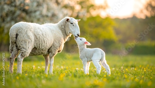 Ewe tenderly nuzzles her newborn lamb in a sun-drenched pasture