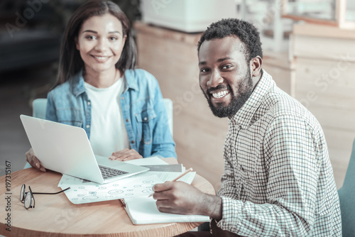 Exam preparation. Happy cheerful nice man sitting together with his friend and studying while preparing for the exam