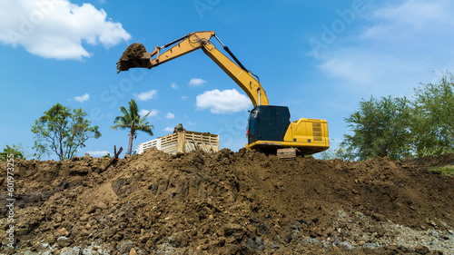 excavating soil into a dump truck to build a pond for store water for use in the dry season for agriculture