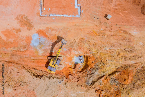 Excavator is digging moving earth on construction site preparing for foundations under works day