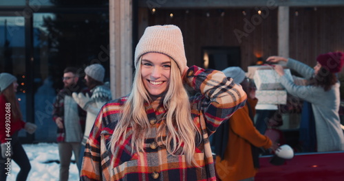 christmas, holiday, portrait, winter, happy, woman, new year, young, lifestyle, beautiful, friendship, terrace, house, snow, vacation, leisure, cinematic, nature, smiling, cheerful, togetherness, excitement, joy, outdoors, positive, slow motion, pullover, relaxation, vitality, youth culture, authentic, chalet, posing, christmas, student, female, hat, inspiration, natural beauty, freelancer, successful, caucasian, 20s, blonde hair, festive