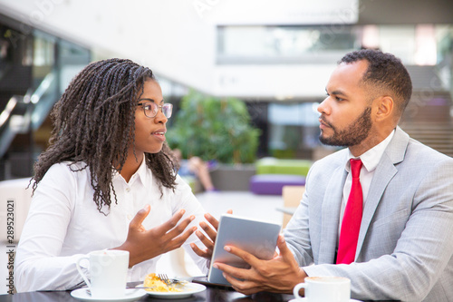 Excited business colleagues discussing tablet app. Diverse business man and woman sitting in cafe, using tablet together and talking. Digital communication concept