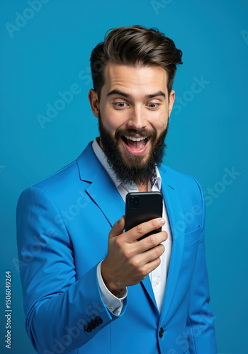 businessman, excited, blue, suit, smartphone, surprised, expression, background, corporate, mobile, technology, business, communication, man, male, holding, young, beard, brown, hair, caucasian, professional, formal, manager, success, career, boss, director, company, finance, banking, insurance, consulting, service, presentation, meeting, workplace, employee, staff, confident, cheerful, modern, phone, device, hand, shock, amazed, happy, laughing