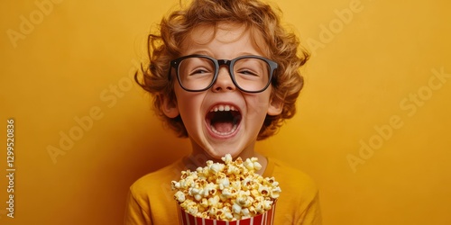 Excited child laughing with oversized glasses while holding a bucket of popcorn against a bright yellow background