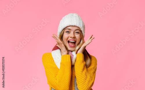 joy, surprised, studio, pretty, amazed, girl, chin, wow, woman, cheerful, sweet, cute, glad, free space, shocked, emotional, empty space, cheering, touching, joyful, smiling, female, shock, gesture, 1, people, playful, young, happy, amazement, advertisement, caucasian, beautiful, background, copy space, omg, hand, camera, adult, yellow, palm, success, person, attractive, happiness, positive, excited