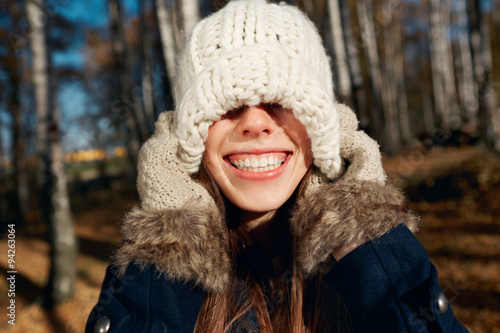 Excited happy fall woman smiling joyful and blissful pull knitted hat outside in colorful fall forest. Beautiful energetic ?aucasian young woman.