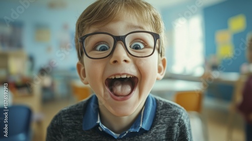 Excited Little Boy with Glasses Makes Funny Face, Wide Eyes and Open Mouth in Classroom