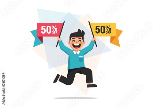 man, running, sale, flag, discount, promotion, happy, excited, offer, shopping, deal, buy, purchase, celebration, joy, enthusiasm, retail, consumerism, marketing, advertising, commercial, product, service, bargain, cheap, affordable, price, reduction, saving, be of use, advantage, opportunity, grab, get, now, today, special, event, season, holiday, celebrate, winner, success, achievement, positive, cheerful, optimistic