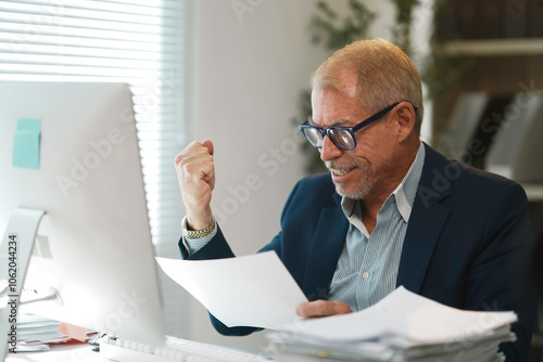 success, business, businessman, office, celebrate, achievement, senior, man, mature, entrepreneur, corporate, executive, winner, victory, happy, excitement, desk, computer, document, reading, finance, career, job, professional, suit, goggles, indoor, workplace, work, winning, accomplishment, motivation, inspiration, growth, positive, result, financial, news, good, report, contract, agreements, deal, elderly, rejoicing, cheerful, satisfied, content