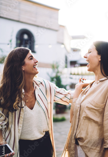 Excited toothy female fellows 20 years old satisfied with random meeting in city downtown, happy Caucasian women laughing rejoicing and socialising during friendly walking at urban streets