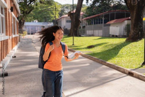 Excited young asian woman running joyfully across a vibrant college campus, holding books tightly and smiling brightly, fully embracing her educational journey and future opportunities
