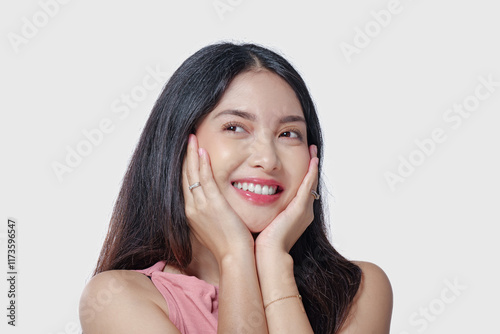 make-up, excited, joyful, positive, smile, woman, cute, proud, cool, smart, looking, successful, confident, studio, background, white, isolated, space, copy, expression, beautiful, pretty, gorgeous, attractive, adult, young, indonesian, southeast, asian, wear, casual attire, standing, happy, cheerful, arm, female, girl, professional, lifestyle, happiness, friendly, gesture, pose, model, indonesia, pink, dress, chinese, lipstick