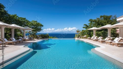 Exclusive sunny poolside oasis with chic loungers and refreshing blue waters for ultimate relaxation and luxury.
