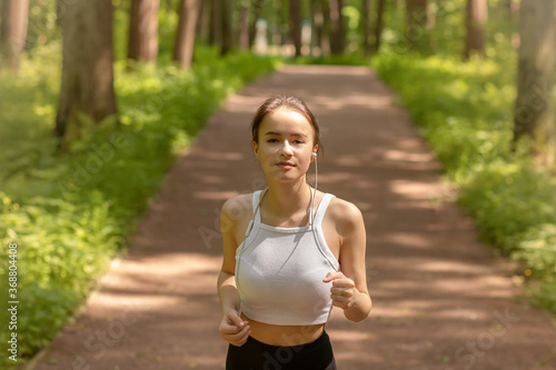 Exercise in the fresh air. Girl runs in headphones in the park among the trees