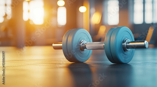 Exercise Technology Concepts Health Research. A close-up of a blue dumbbell on a gym floor, illuminated by warm sunlight, symbolizing fitness and strength training.