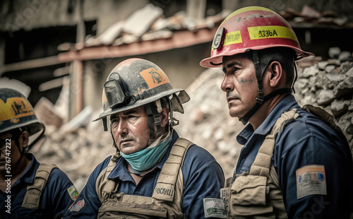 exhausted firefighters after an earthquake or similar tragedy, fictitious place and people. Generative AI