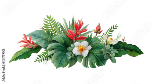 Exotic Colorful Tropical Flowers and Leaves Arrangement Isolated Transparent Background