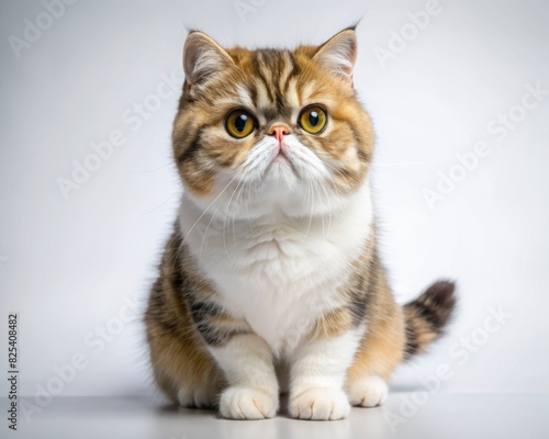 Exotic Shorthair breed cat sitting isolated on white background looking at camera.