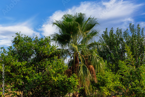 Exotic vegetation on the Mediterranean coast. Turkish palms. The green province of Antalya in Turkey. Background