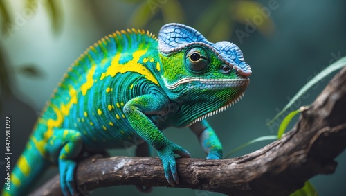 Exotic wildlife photograph of a multicolor chameleon on a branch highlighting its natural camouflage