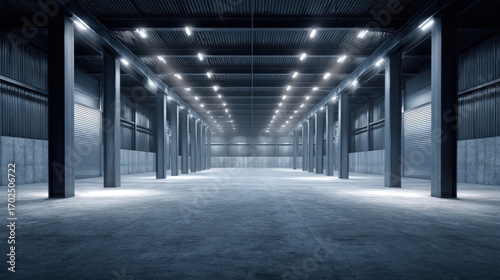 empty, warehouse, interior, concrete, steel, modern, lighting, system, industrial, space, building, floor, pillar, column, architecture, structure, storage, distribution, logistic, factory, manufacturing, production, industry, illumination, bright, perspective, background, design, infrastructure, construction, commercial, real, estate, rental, large, hall, showroom, exhibition, center, event