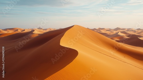 Expansive Golden Dunes Under Soft Blue Sky with Gentle Clouds in a Serene Desert Landscape at Sunrise or Sunset