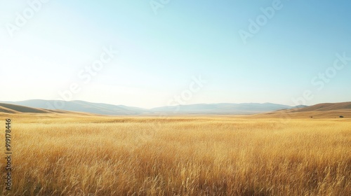 Expansive grassland with golden grasses swaying in the breeze under a clear sky
