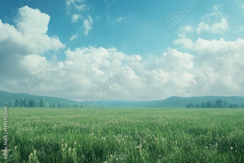 Expansive Green Field Under Blue Sky with Beautiful Clouds and Trees in the Distant Countryside