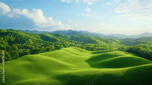 Expansive green hills rolling under wide open sky create serene landscape. lush greenery and gentle slopes evoke sense of tranquility and connection to nature