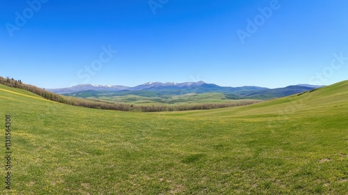Expansive Green Meadow with Mountains Under Clear Blue Sky in Springtime