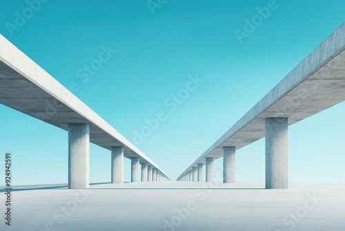 infrastructure, development, architecture, pillar, beam, concrete, modernism, blue skies, symmetry, calmness, innovation, design, future, planning, engineering, construction, immensity, connection, perspective, aesthetic, urban, minimalism, geometry, landscape, horizon, outdoors, technology, sustainability, progress, public works, transportation, structural, open space, clarity, efficiency, vision, city planning, visual arts, sleek, artistic, contemporary, modern architecture, building