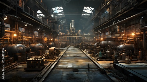 factory, industrial, machinery, production, manufacturing, equipment, automation, technology, engineering, workshop, metalworking, fabrication, assembly, processing, metallic, mechanical, automated, industry, warehouse, facility, workstation, plant, mill, refinery, assembly line, conveyer, gear, wheel, engine, tool, pipe, metal, steel, rust, grunge, grimy, dirty, messy, vintage, retro