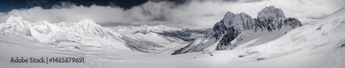 snow, mountain, panorama, winter, landscape, cloud, sky, mountain chain, nature, outdoors, cold, rocky, scenery, high altitude, fog, ridge, vale, frost, winter landscape, overcast, natural beauty, remote, serene, quiet, majestic, weather, terrain, rough, wild, environment, seasonal, daylight, horizon, skyline, alpine, isolated, glacé, climate, expanse, contrast, chill, wintery, mountainous