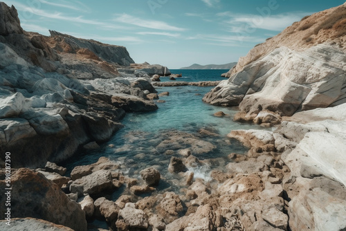 Experience the tranquil beauty of Milos island with its stunning rocky landscape and breathtaking sea views. Ai generated.