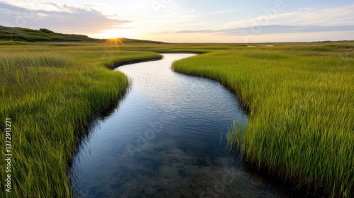 Experience the tranquility of peaceful marshlands framing a spectacular sunset over the horizon, inviting serenity and a connection with nature's incredible beauty.