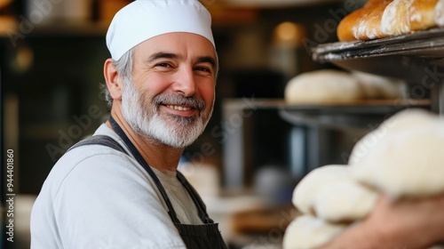 baker, man, middle-aged, smiling, focused, chef, pastry, dough, bread, oven, flour, apron, hand, professional, kitchen, equipment, ingredient, cook, culinary, artisan, kneading, cake, confection, tray, pan, fresh, warm, preparation, workstation, batch, receipe, utensil, process, craft, donut