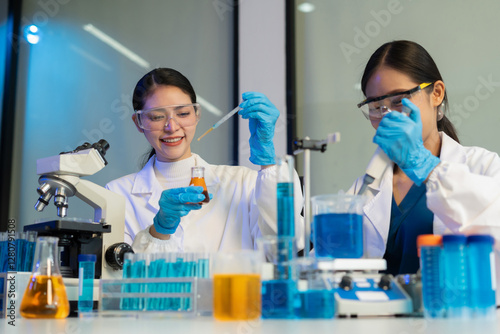 experiments containing chemical liquid in laboratory on glassware, innovative and technology.