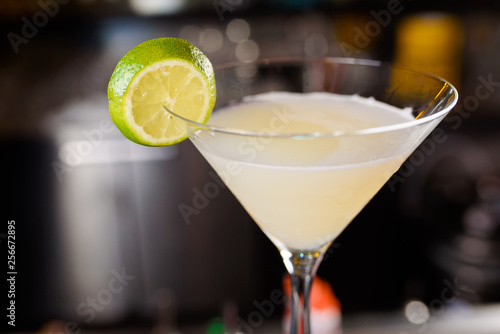 Expert barman is making cocktail at night club, Barman holds a cocktail in his hand. No face. Selective focus
